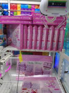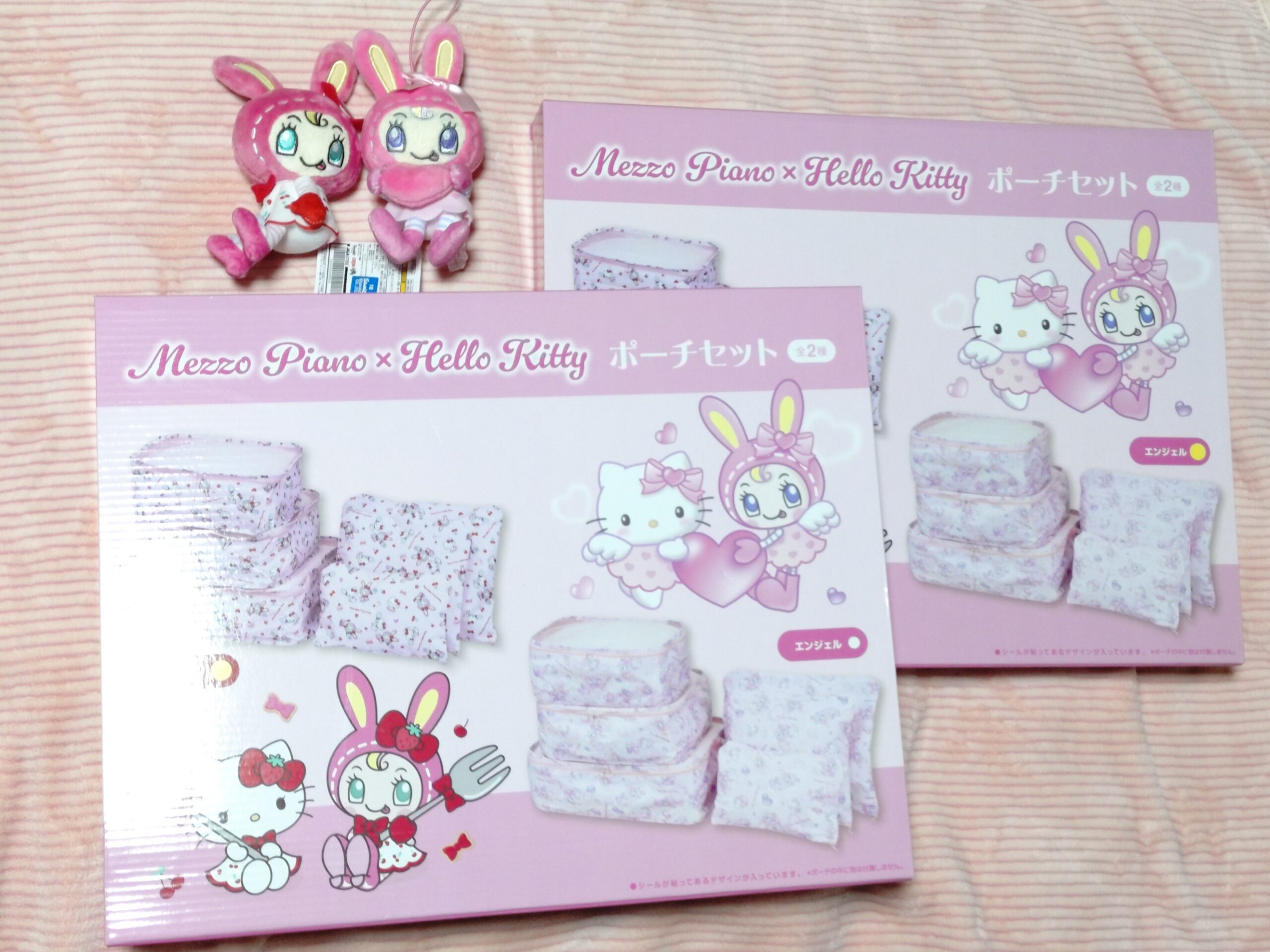 《メゾピアノ×ハローキティポーチセット》チェリー柄とエンジェル柄があり両方GETすべく頑張りました。普通のクレーンではなく、地道にフック?を動かしていくタイプの機械でだいぶ苦戦しました。泣