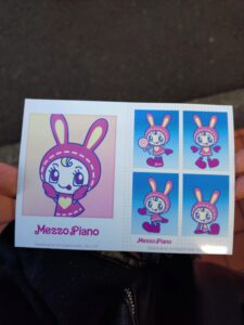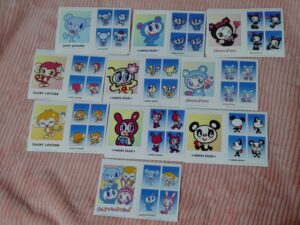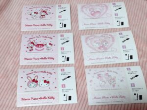 ↑こちらは6種類あり、柄を選ぶことができるので全種類印刷しました!ほんわか雰囲気のベリエちゃんとキティちゃんがとてもかわいらしいです。切ってスマホケースに挟んで使うようですが、コレクションとしてとっておくのも良いですね! 続いてランダムブロマイド、こちらはメゾピアノ、エンジェルブルー、ポンポネット、デイジーラヴァーズのナルミヤキャラクターズ11種類のラインナップ。柄を選ぶことができないので出てくるまでドキドキです。メゾピアノキャラクターと集合の4種類を狙っていたのですが、なかなか出ない&かぶりまくりでした。涙